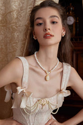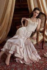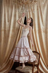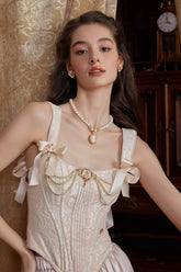 This refined two-piece set channels an elegant French court-inspired aesthetic with a romantic, regal silhouette. The structured jacquard corset top features classic fishbone construction for a sculpted fit, enhanced by delicate textural detailing that elevates its vintage charm. Paired with a high-waist satin skirt finished with soft ruffle accents, the design balances structure and fluidity for a graceful, feminine look. Ideal for occasions that call for sophistication and statement styling, this set delivers timeless elegance with a couture-inspired finish.