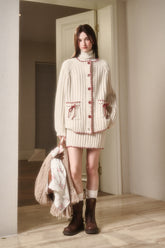 Evoking the serene elegance of northern winters, the “Latitude 69°” set combines refined craftsmanship with cozy warmth. The long-line knit top features a soft wool-blend construction accented by delicate contrast trims, exuding understated sophistication. Paired with a matching mini skirt, the ensemble balances relaxed proportions with graceful femininity — a versatile choice for effortless everyday styling with a touch of Nordic charm.