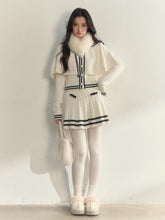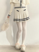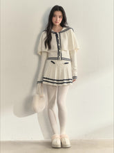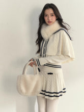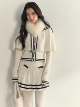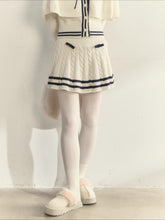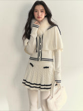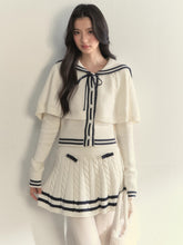 Crafted from fine-gauge knit fabric, this set combines a soft, skin-friendly texture with a structured drape for effortless elegance. The integrated sailor collar and cape design are paired with classic contrasting stripes, creating refined depth and a flattering shoulder line. The front features a functional button-down closure, each button resembling a vintage pearl, adding a touch of sophistication. The skirt is designed with intricate cable-knit patterns that visually elongate the legs, showcasing artisanal craftsmanship and subtle texture. Hand-tied bows at the waist complete the look with a delicate feminine charm.