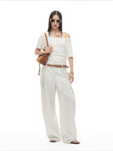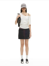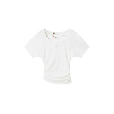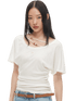 Crafted from a premium Tencel-merino wool blend, this relaxed-fit tee features a soft, breathable texture with a subtle sheer finish. The design highlights an elegant asymmetric off-shoulder neckline, enhanced with delicate beaded detailing and refined pleating that creates a sculpted hourglass-inspired silhouette. Lightweight and fluid, it drapes effortlessly on the body, offering a modern, understated statement perfect for elevated everyday styling.