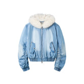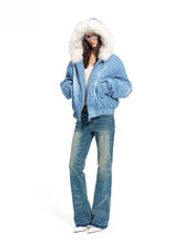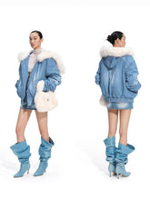 From the Lynx Series, the Lynx Denim Puffer Jacket merges classic denim craftsmanship with modern warmth and texture. The body is constructed from premium heavy-wash twill denim, made of 100% cotton with a dense diagonal weave that ensures structure, durability, and a refined matte finish. The fabric undergoes multiple washing and fading processes to achieve a naturally soft hand feel and a subtle vintage tone. The collar features eco-friendly dual-tone faux fox fur, crafted from high-density polyester fibers that mimic the plush volume and smooth luster of real fur, offering both warmth and sophistication. With its relaxed silhouette and tactile layering, the piece embodies rugged utility balanced with elevated urban style.