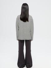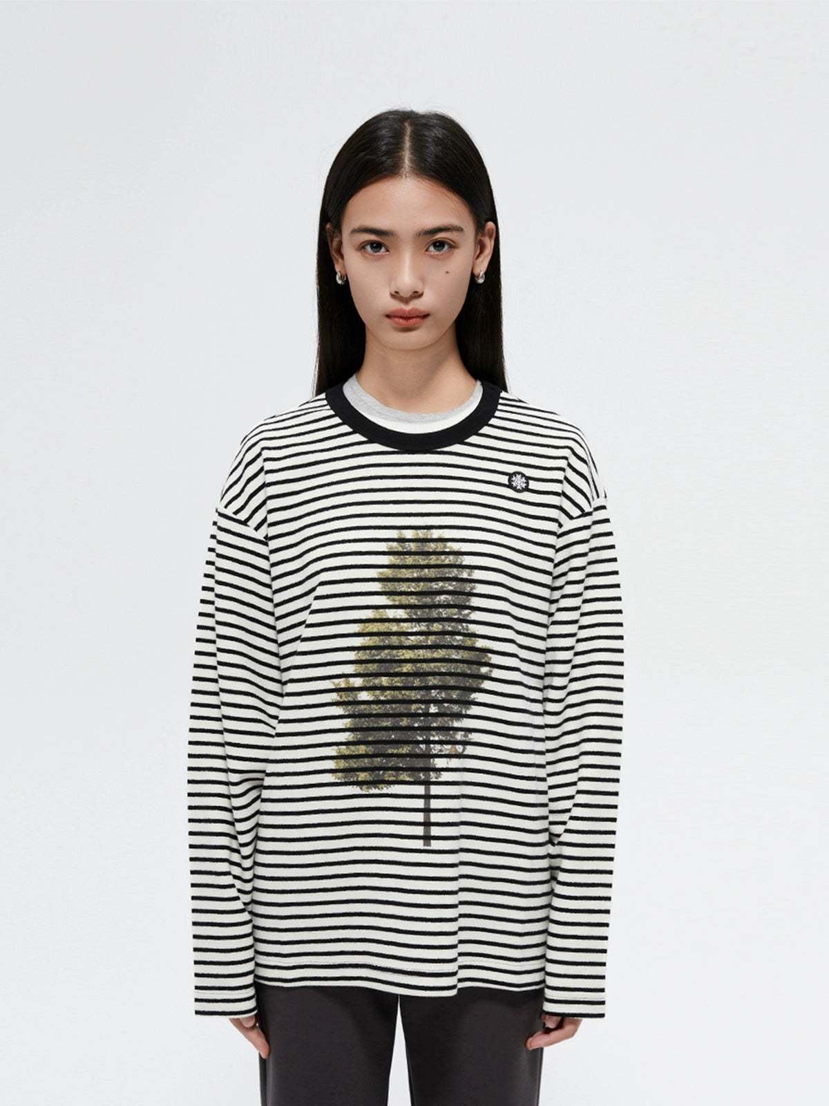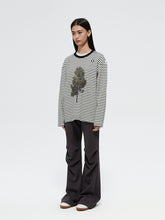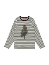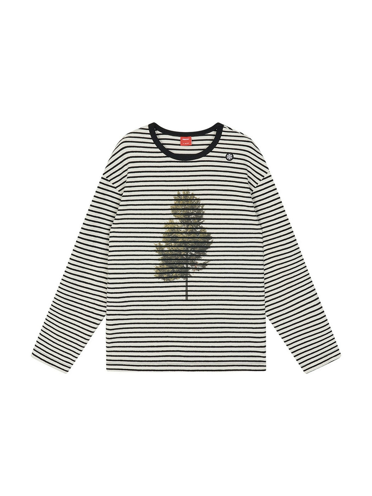This garment features a classic black and white striped base, with the white being more of a beige tone, making it ideal for the fall and winter seasons. The fabric has a textured, fleece-like feel on the outside, ensuring warmth in cooler weather, while the inner surface is smooth for comfort. The front features a tree graphic, adding a playful touch, while the shoulder showcases a brand-embroidered snowflake, adding detailed craftsmanship.