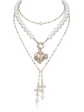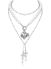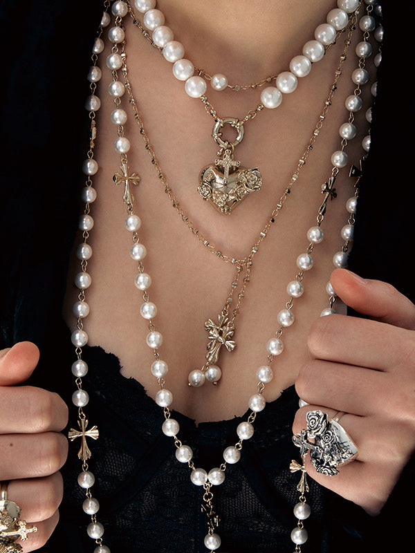 This long, layered necklace from M2M features an angelic heart pendant adorned with pearls and cross motifs, crafted with a punk-inspired design. The unique and luxurious style makes it a versatile accessory for various looks.