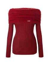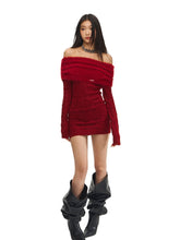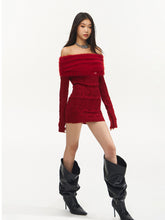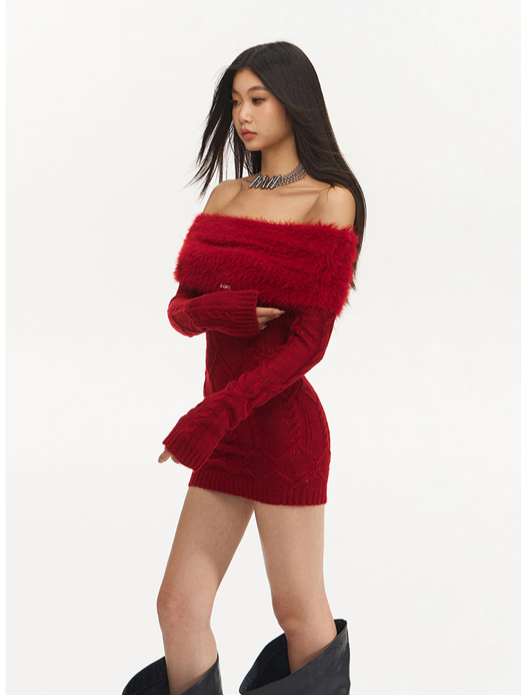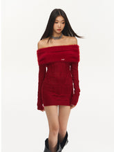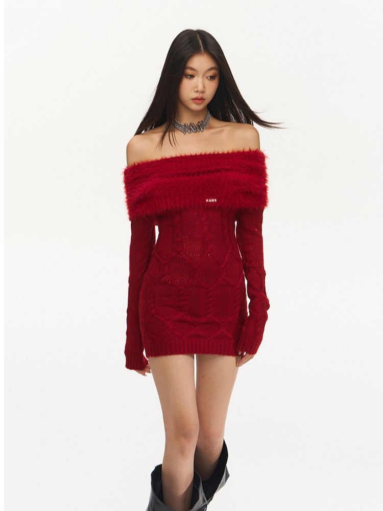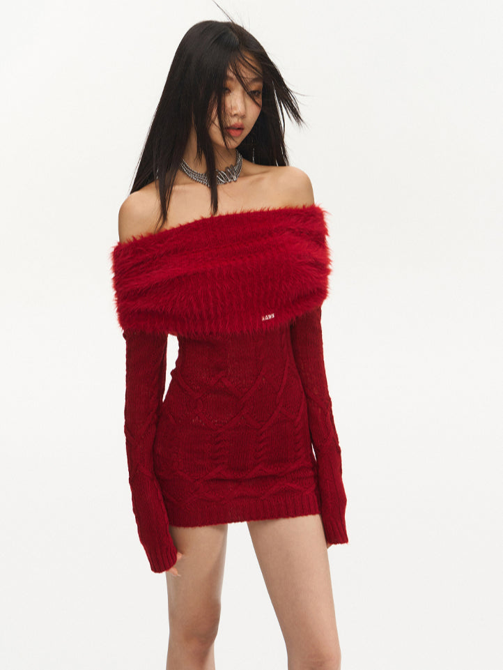 Red Off-Shoulder Mohair Knitted Dress - CHINASQUAD