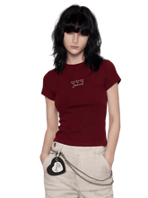 A playful yet chic T-shirt designed with a lipstick graffiti graphic that adds a bold, artistic touch. Featuring delicate mini cap sleeves and a slim-fit silhouette, this piece highlights the shoulders and flatters the figure with a clean, feminine line. Crafted for Autumn wear, it works effortlessly on its own or layered under jackets, blending youthful energy with modern street-style appeal.