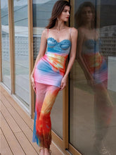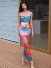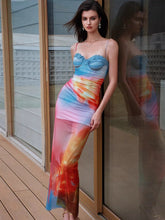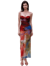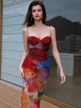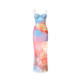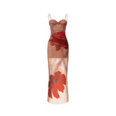 This elegant resort-inspired maxi dress features a halter neckline paired with a sculpted corset structure, creating the illusion of a refined two-piece silhouette. Designed with floral ink-wash mesh, it delivers an airy, artistic aesthetic while softly contouring the body. The fitted bust and waist enhance feminine curves, flowing seamlessly into a long, fluid skirt that elongates the figure. Perfect for vacations, evening occasions, or statement styling, this dress blends romance, structure, and modern elegance.