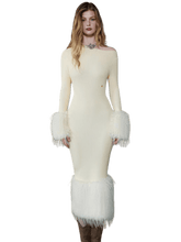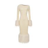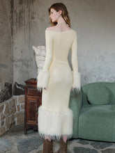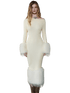 This refined maxi dress features a vintage-inspired off-shoulder neckline paired with a sleek, body-hugging silhouette. Designed with eco-fur patchwork accents, it adds texture contrast and visual depth to the minimalist knit base. The fitted waist and hip-contouring cut enhance natural curves, while the long length elongates the figure for an elegant, sophisticated look. Ideal for evening outings or elevated daily styling, this piece blends modern femininity with subtle retro charm.