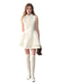 The soft fabric creates a smooth, fluid texture, exuding an elegant and fresh feel. The white color blends with the soft pink tones for a sweet and chic look. The fabric provides comfort and flexibility, combining rich detailing with playful designs. The dress features a round neck and soft pleating, complementing the flattering princess bubble design. The tailored fit highlights the waist and enhances a slender silhouette, offering a structured and stylish look. The design allows for easy movement while maintaining a soft, elegant appearance.