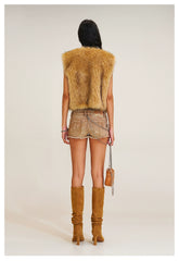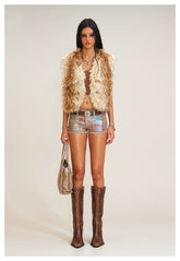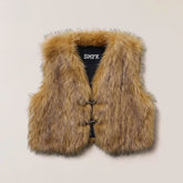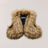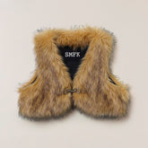 From the SMFK COMPASS collection, this oversized faux-fur vest embodies the balance between structure and texture that defines the brand’s design philosophy. Introduced in the 2025 “Wild World” series, it reinterprets spring–autumn layering with a bold cropped silhouette inspired by the vastness of plains and grasslands. The piece uses premium two-tone faux fur to replicate natural animal textures, offering a voluminous yet soft appearance. Its short cut and leather-style inner construction make it ideal for pairing with shirts or trousers, adding depth and warmth to any seasonal look.