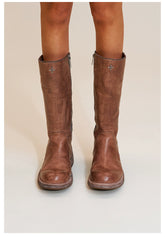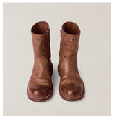 From the RAGE handcrafted collection, this series continues SMFK’s tradition of classic shoemaking infused with raw, untamed aesthetics. Each pair is crafted from premium horsehide using time-honored water-dyeing methods — the leather is batch-dyed in rotary barrels, where movement and friction naturally polish and enrich the surface, giving it a distinctive mottled tone and refined sheen. The GOODYEAR hand-welted construction firmly unites the leather upper with the sole, ensuring exceptional durability and comfort over time. Inspired by the boots worn by grassland horsemen, the design captures an authentic rugged charm with elevated craftsmanship. A metallic cross-flower emblem adorns the tongue, a signature mark of SMFK’s artisanal identity.