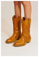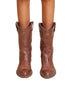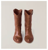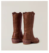 The RAGE handcrafted series continues SMFK’s legacy of traditional shoemaking, celebrating raw beauty through superior craftsmanship. Each pair begins with a meticulous selection of premium horsehide, embodying the brand’s untamed aesthetic and artisanal spirit. Using classical water-dyeing techniques, the natural leather is batch-dyed in rotating barrels, allowing the color and texture to evolve organically during the tumbling process. This creates a unique patina and lustrous finish that highlights the leather’s inherent grain and depth. The GOODYEAR hand-welted construction fuses the upper with a full leather sole, ensuring long-lasting structure and comfort. Styled in a classic cowboy boot silhouette with SMFK’s signature angular V-cut shaft, it combines refined vintage character with bold modern design. The tongue is adorned with a metallic cross emblem, a hallmark of SMFK craftsmanship.