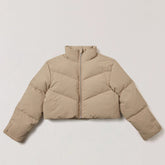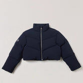 A contemporary cropped down jacket designed with a structured silhouette and a sculptural cross-inspired motif. The style blends utilitarian outdoor elements with modern streetwear attitude, offering warmth, water-repellent performance, and a clean minimalist finish. Filled with premium white duck down for lightweight insulation, this jacket provides dependable protection in cold weather while maintaining a sleek, fashion-forward profile.