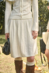 Inspired by quiet winter charm, this wool-blend knit set pairs a cropped cape-style sweater with a matching high-waisted skirt for a refined yet cozy silhouette. The softly structured top drapes elegantly across the shoulders, while the fitted skirt accentuates natural curves with understated warmth. Crafted from a plush, stretchy knit, it balances elegance and comfort — perfect for both casual gatherings and chic seasonal layering.