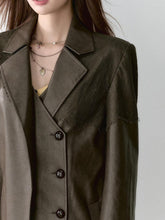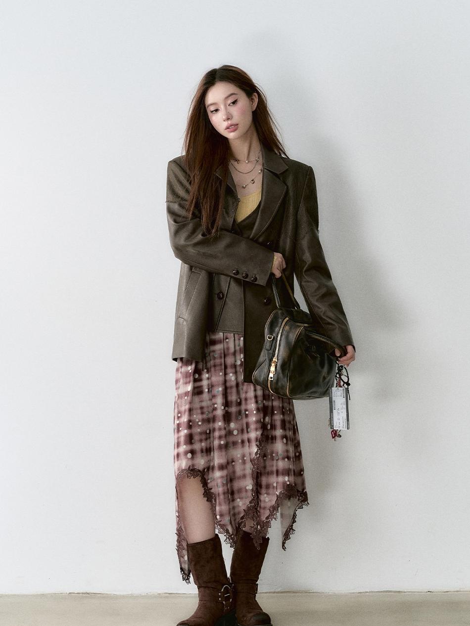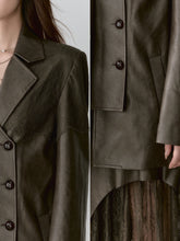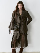 Structured Laced Leather Blazer This blazer is crafted from a luxurious blend of heavy silk and vegan leather, providing a refined and polished appearance. The PU leather offers a smooth and supple texture, closely mimicking the feel of premium lambskin while adhering to environmental protection principles. The addition of spandex enhances flexibility, ensuring a comfortable fit that moves with your body. The blazer features a two-tone embossed pattern on the surface, adding depth and sophistication to the design. The double-layer door placket emphasizes structural detailing, while the matching half-skirt completes the ensemble with a modern, stylish edge. This piece is perfect for breaking free from traditional fashion boundaries, creating a statement look that’s both unique and versatile.