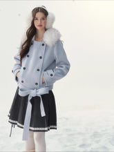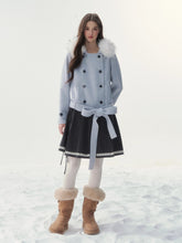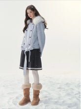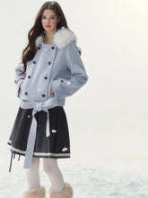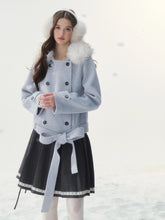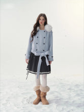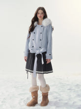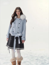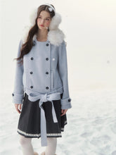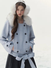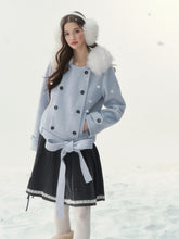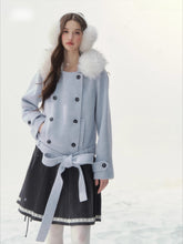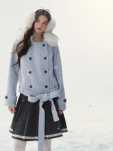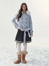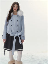 A refined retro-inspired double-breasted coat crafted in a soft wool-blend, presented in a dreamy misty blue shade reminiscent of iris petals. Designed with a plush faux-fur collar and clean tailored silhouette, this piece brings together warmth, elegance, and a touch of old-world charm—perfect for elevated winter styling.