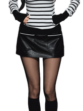 A modern take on the classic tweed aesthetic, this low-waist mini skirt features a sleek faux leather finish with contrast detailing that highlights a chic and structured silhouette. The fitted, hip-hugging cut enhances the figure, while the soft lining ensures comfort and flexibility. Perfect for pairing with knit tops or cropped jackets, this skirt adds a bold, fashion-forward edge to any winter outfit.