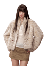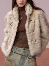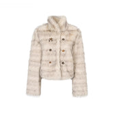 This autumn–winter short faux-fur coat features a soft, dense plush texture that delivers warmth and a luxurious tactile feel. Designed with a structured silhouette, the garment combines retro-inspired double-breasted styling with heavy-duty decorative buttons for an elevated, crafted look. The fabric maintains a smooth, velvety surface with consistent pile, enhancing both comfort and visual richness. Its cropped length balances proportion and versatility, making it ideal for chic seasonal layering.