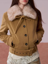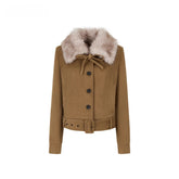 This autumn–winter jacket is crafted from a multi-fiber blended melton-like fabric featuring a clean diagonal texture and a compact, structured hand feel. After a specialized brushing and finishing process, the surface becomes smooth, soft, and skin-friendly. The detachable plush collar adds warmth and a touch of playful elegance, while the quilted padding ensures insulation without bulk. The bow-tie fastening enhances the feminine silhouette, and the dyed fabric displays rich tonal depth for an elevated, cozy seasonal look.