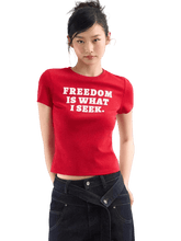 A vibrant red short-sleeve T-shirt designed for a festive spring mood. Featuring a bold letter slogan print on the front, this piece delivers a confident, youthful attitude with a clean, modern silhouette. The fitted cut highlights the figure while remaining comfortable and versatile, making it easy to style with jeans, skirts, or layered looks. Perfect as a statement top for everyday wear or seasonal occasions.