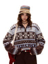 A chic vintage-inspired pullover sweater featuring a Fair Isle jacquard pattern with a contrast color design and a classic turn-down collar. The half-zip front and fringe-trimmed hem add a touch of playful sophistication, while the relaxed cropped silhouette offers a flattering and modern fit. Perfect for transitional weather, this piece combines warmth, texture, and timeless retro charm.