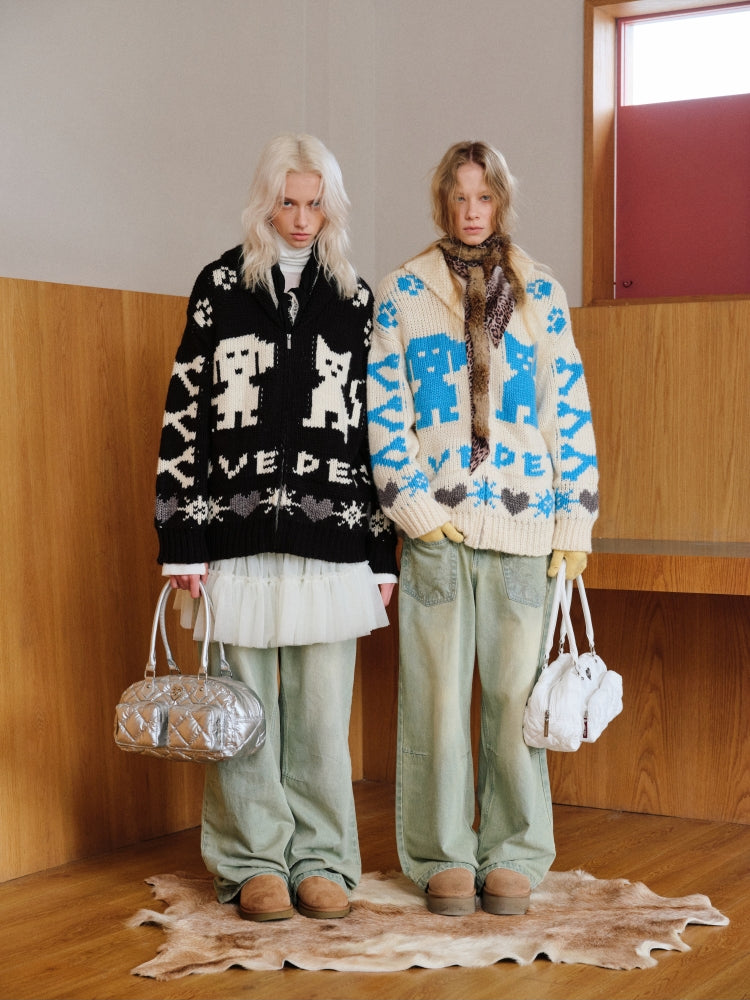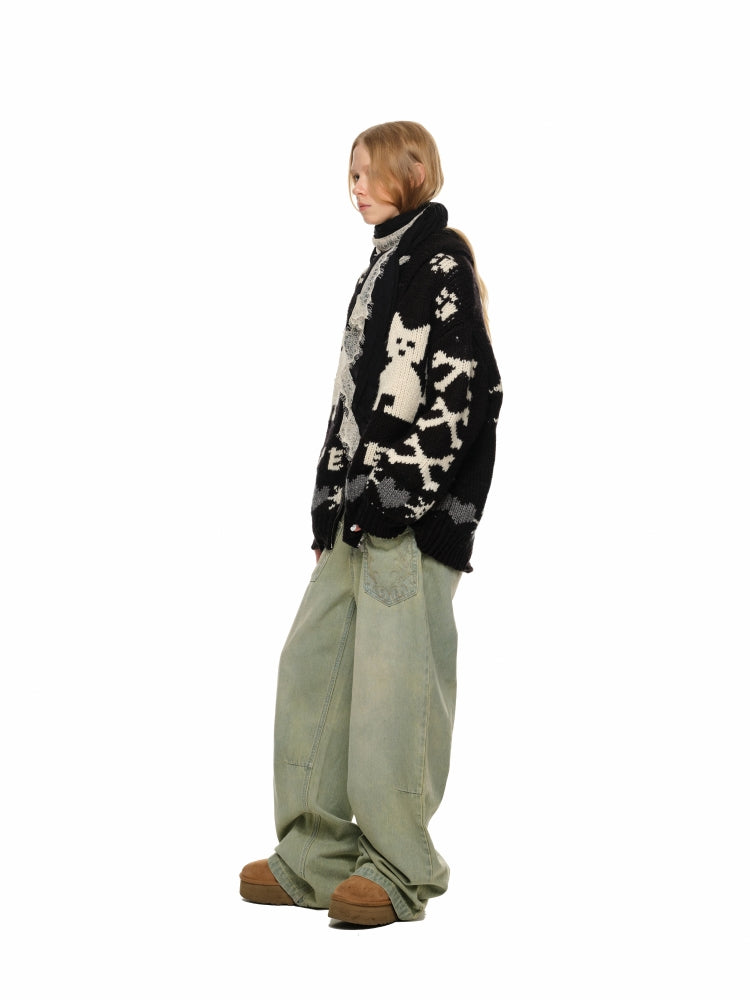 This vintage chunky knit cardigan features a bold jacquard pattern with a cozy oversized fit. Perfect for adding warmth to any outfit during colder months, the unisex design is available in S and M sizes.