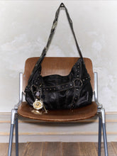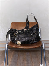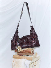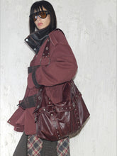 A statement piece from 2th Desire, this vintage-inspired crossbody bag channels street and wasteland aesthetics with its bold hardware and washed textures. Featuring a wide adjustable shoulder strap adorned with large metallic eyelets, it combines rugged charm with functional design. The spacious interior easily accommodates everyday essentials like tablets or notebooks, while the side metal rings and rivet details enhance its structured silhouette — making it a must-have accessory for winter street style.