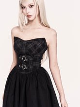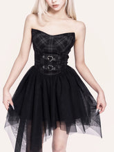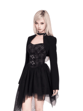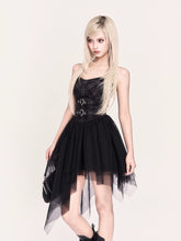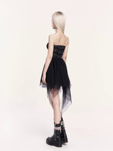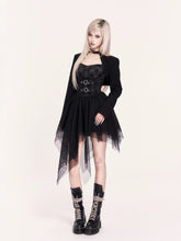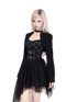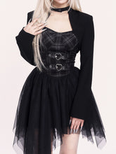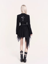 This statement two-piece set blends rebellious rock attitude with a soft subcultural edge. The look features an irregular tulle corset dress with a structured bodice and layered mesh skirt, creating dramatic volume and movement while sculpting the waist. Paired with a cropped cross-style bolero jacket, the set adds sharp contrast and attitude through clean lines and minimalist coverage. Perfect for year-end parties, stage looks, or bold street styling, this set delivers a striking balance of toughness and romance.