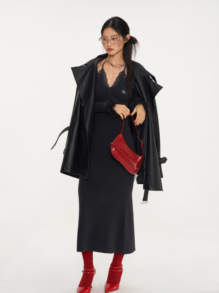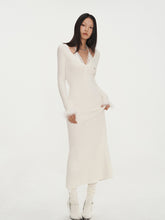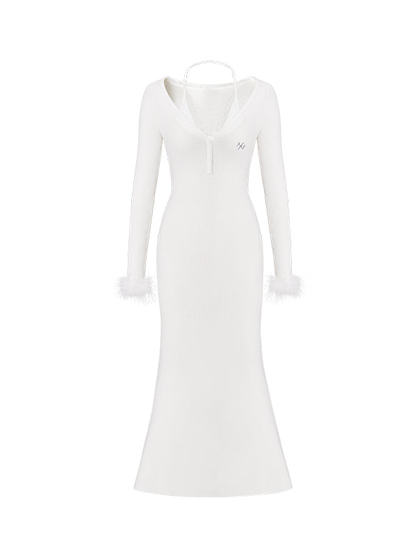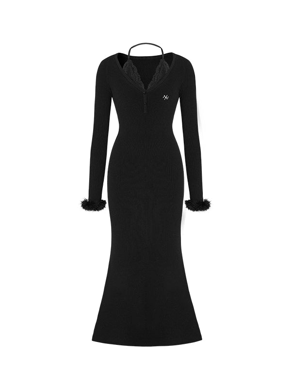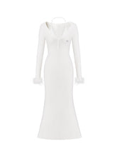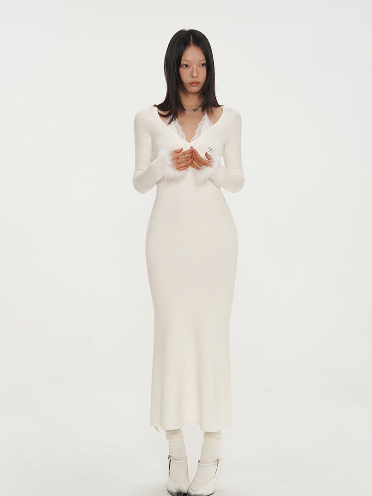 A refined mermaid-style dress available in two colors: mysterious black and moonlight white. Featuring soft lace trims, faux fur sleeve accents, and a flattering slim fit, it offers elegance and comfort.