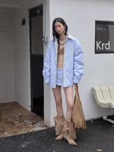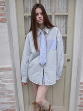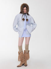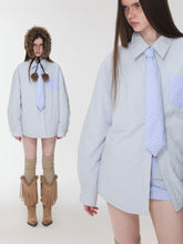 A playful three-piece winter set including a reversible striped cotton jacket, matching embroidered skirt, and coordinating tie. The jacket features a loose, wide-striped color-block design that can be worn on both sides for versatile styling. It is decorated with 3D floral embroidery and a hand-stitched cat ID label, adding a charming touch. The cotton collar and button details lend a preppy academic vibe, while the relaxed silhouette keeps it cozy and effortless.