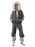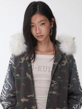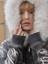 This coordinated set is crafted from custom high-density camouflage fabric, featuring a classic oversized hooded sweatshirt with three-dimensional embroidered lettering along the sides. The detachable faux-fur hood trim adds versatility and texture, creating a bold streetwear aesthetic.