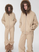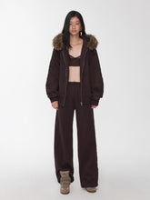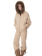 A meticulously crafted sweatshirt–jogger ensemble featuring original embroidered lettering. The hoodie is designed in a relaxed classic silhouette and trimmed with a detachable faux-fur collar, blending street-art sensibility with versatile styling. The matching pants adopt a loose straight-cut profile with an adjustable drawstring waist and toggle-adjusted cuffs for a clean, slimming, yet effortless look. Crafted from high-density brushed fleece, the set offers long-lasting warmth, softness, and shape retention.