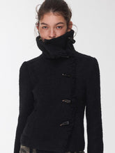 A cropped, figure-flattering wool coat featuring a sculpted silhouette enhanced by multi-curve paneling for precise shaping. The design reinterprets the classic high-neck structure with an asymmetrical side placket, fastened by natural horn buttons that exude a refined vintage collegiate charm. Decorative lace-inspired detailing along the closure adds a graceful contrast to the tactile wool-blend fabric, infusing the piece with a touch of lightness and femininity.