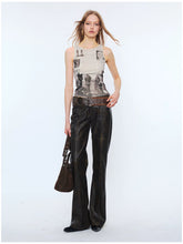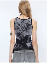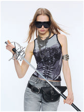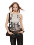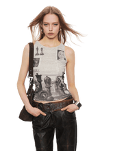 A distinctive reversible tank top featuring a bold newspaper-inspired print combined with delicate contrast lace paneling. Designed for dual wear, this piece can be styled front or back, offering versatile looks in one. The fitted silhouette with a cinched waist enhances body lines, while the stretch fabric ensures comfort and flexibility. A perfect blend of vintage graphic aesthetics and feminine detailing for statement summer styling.