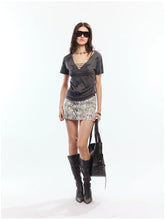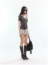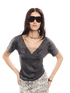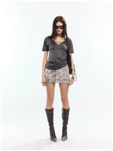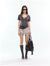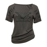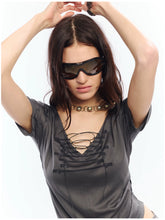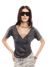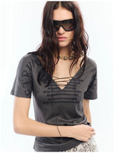 A statement short-sleeve T-shirt inspired by American retro aesthetics, featuring a bold graphic print and distinctive lace-up “pirate” neckline detail. The deep V-neck design enhances the neckline, while the adjustable tie-front adds both structure and a touch of edgy femininity. Cut in a slim silhouette, this piece flatters the body and pairs effortlessly with denim or statement bottoms for a confident, fashion-forward look.