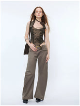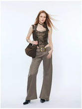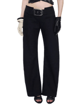 These original-design trousers feature a subtly curved straight-leg cut with a punk-inspired attitude. Finished with a distressed metal waistband, D-ring buckle detailing, utility pockets, and industrial eyelet accents, the silhouette balances sharp tailoring with relaxed wearability. The clean structure and understated curve through the leg create a modern street–meets–formal look, making them versatile for both edgy daily styling and elevated outfits.
