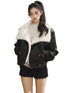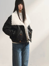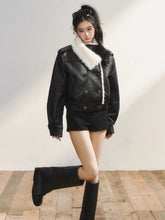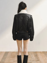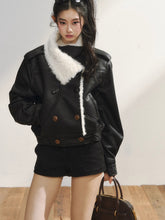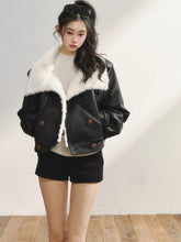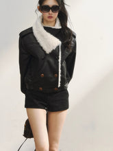 Crafted from soft faux leather and plush shearling, this short jacket perfectly balances retro sophistication with modern sweetness. The structured double-breasted front and metallic buttons create a refined vintage aura, while the wide shearling lapel and lining add a touch of cozy warmth and texture. The interplay of smooth leather and soft fur softens the usual toughness of moto-inspired outerwear, presenting a chic interpretation of “sweet-edgy vintage.”
