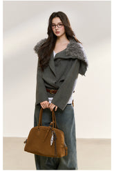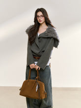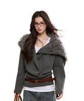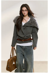 A contemporary wrap-style knit sweater that merges classic tailoring with a cinched waist belt for a refined silhouette. Designed to break away from the loose habits of traditional knitwear, it achieves a balanced sense of softness and structure through adjustable waist detailing. The oversized shawl-style faux fur collar enhances the retro-chic atmosphere, creating a striking contrast with the vertical texture of the knit fabric. The collar can be pulled up to transform into a hood, adding both functionality and design flair. Crafted from soft, skin-friendly knit material for warmth and comfort, this piece is ideal for autumn and winter styling.