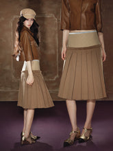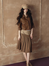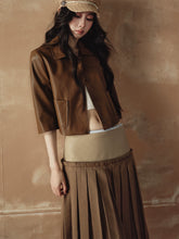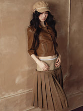 This refined two-piece set features a cropped PU leather jacket paired with a flowing pleated A-line skirt, delivering a polished yet feminine silhouette inspired by modern Miu-style aesthetics. The jacket is designed with a clean cropped cut and three-quarter sleeves, offering structure without heaviness. The skirt is crafted with a satin-like drape and diamond-textured leather detailing, creating elegant movement and visual depth. Together, the set balances softness and structure, making it a versatile choice for elevated everyday styling or chic occasions.