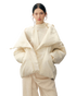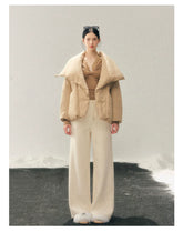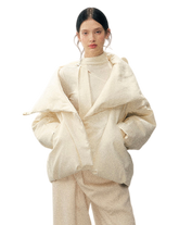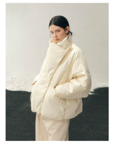 Inspired by the soft volume of freshly fallen snow, this statement winter puffer jacket features an exaggerated, cloud-like silhouette with a protective high neck. Designed for maximum warmth, it is generously filled with premium 90% white duck down, offering excellent insulation while remaining lightweight and comfortable. The oversized cut and dropped shoulders create a modern, relaxed look that pairs effortlessly with winter layers, making it ideal for cold-weather city wear and everyday styling with a bold, cozy attitude.