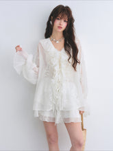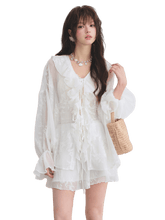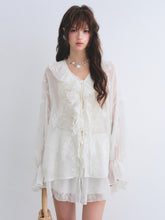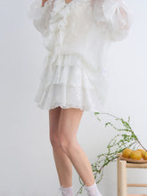 A romantic two-piece set featuring a lightweight chiffon shirt with delicate embroidery and soft ruffle detailing, paired with a tiered cake skirt for a playful yet elegant silhouette. The shirt is designed with a relaxed fit and sun-protective feel, while the skirt features an elastic waistband for comfort and added coverage. Feminine and airy, this set is perfect for effortless summer styling with a refined, graceful touch.
