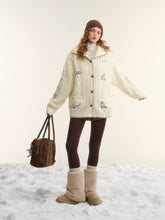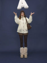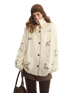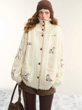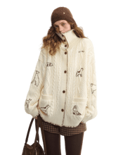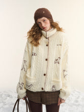 A cozy cable-knit outerwear piece designed with a stand collar and a relaxed, easy silhouette. Featuring delicate embroidery inspired by a “First Snow Puppy” motif, this cardigan-style jacket blends playful charm with a laid-back aesthetic. The structured shoulders and loose fit make it ideal for effortless layering, while the knit texture adds warmth and visual depth for everyday wear.