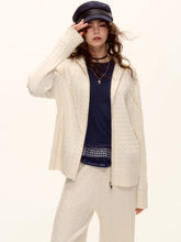 A relaxed yet refined two-piece knit set featuring a wool-blend cable knit zip-up hoodie paired with elastic-waist wide-leg pants. Designed for effortless comfort and laid-back sophistication, the set showcases a textured cable pattern with a soft hand feel and natural drape. Perfect for cozy weekends or chic streetwear looks, combining warmth, flexibility, and style in one elevated ensemble.