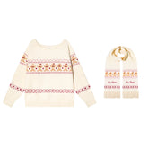 A festive and cozy knitwear set featuring an off-shoulder sweater with classic Fair Isle patterns and playful gingerbread-man motifs. The relaxed silhouette delivers a soft, lazy-chic vibe, while the matching scarf adds both warmth and seasonal charm. Crafted in a comfortable wool-blend yarn, this set is perfect for wintertime styling, offering a balance of cuteness, comfort, and effortless versatility.