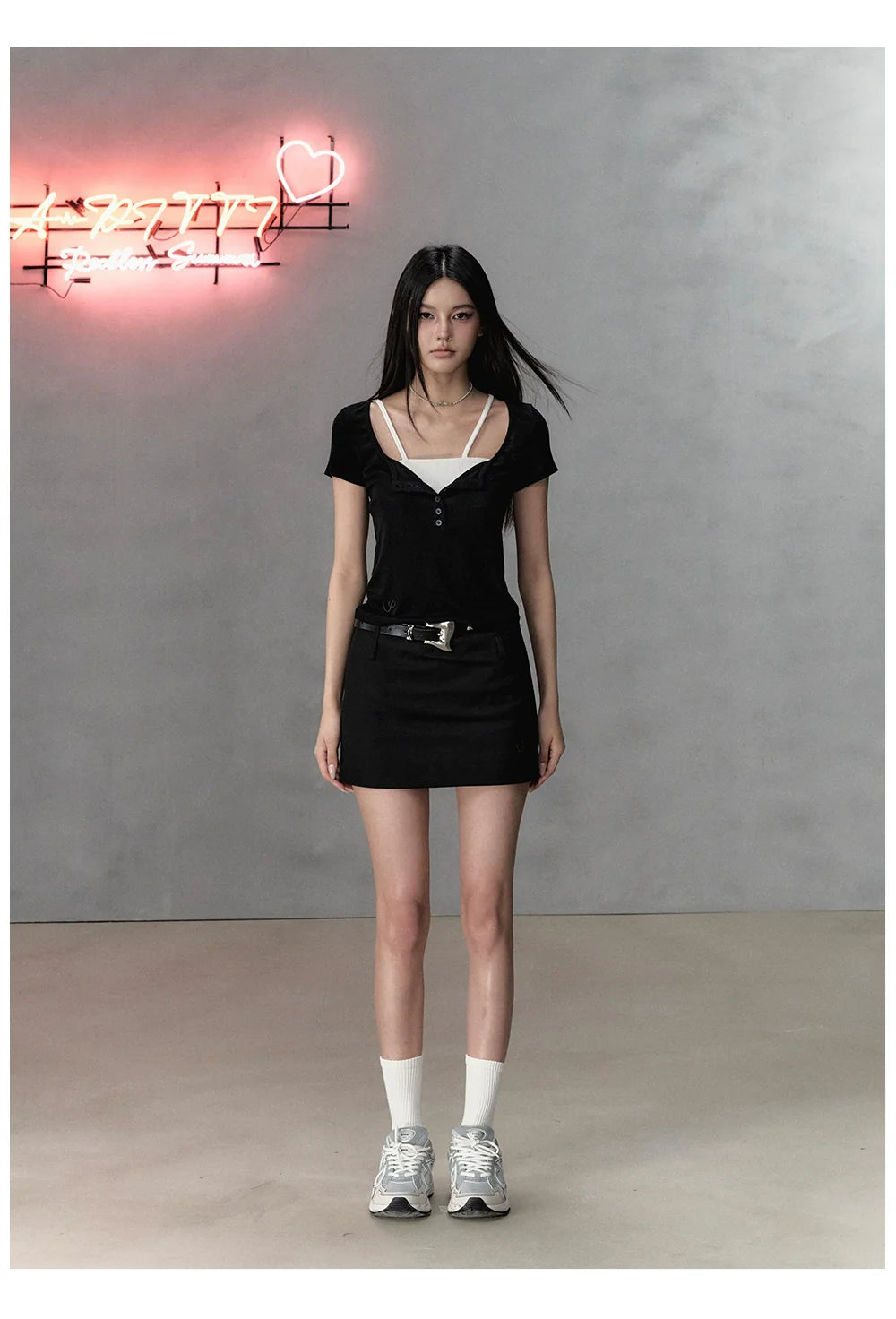 Black & Grey Henley Collar Embroidered T-Shirt - CHINASQUAD