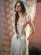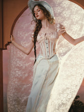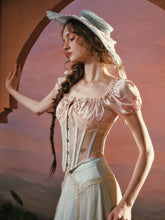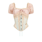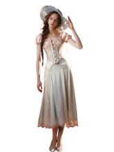 This French vintage court-inspired two-piece set exudes romantic elegance with a refined satin finish and delicate lace detailing. The corset top is structured with multiple boning panels to sculpt and support the silhouette, enhanced by contrast lace overlays and soft pastel tones for a sophisticated layered look. The front features classic metal busk closures for ease of wear, while the adjustable lace-up back allows for a customizable fit. A softly gathered neckline with lace trim and adjustable drawstring adds a gentle, feminine touch. The matching skirt features a fluid drape with a clean, high-waisted design that elongates the figure, completing a graceful and timeless ensemble.