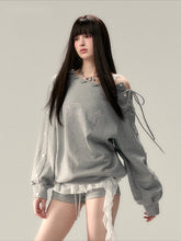 The sweatshirt features an off-shoulder design with a diagonal cut, adding a fashionable and modern touch. The strap and snap fasteners allow for flexible styling and effortless switching between looks. Front rhinestone embellishments enhance its refined details, exuding charm and elegance. Perfectly paired with matching bottoms to express both casual ease and a street-style vibe.