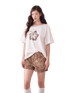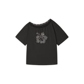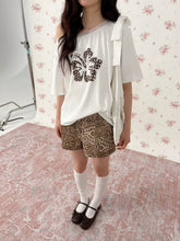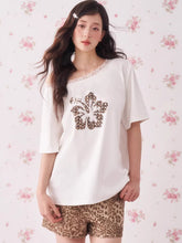 This statement T-shirt blends playful summer elements with a bold vintage aesthetic. Featuring a striking leopard and hibiscus rhinestone graphic, the design adds a subtle sparkle and artistic texture to the piece. The asymmetrical one-shoulder silhouette creates a modern, fashion-forward look while highlighting the neckline and shoulders. Finished with delicate lace short sleeves, the top balances edgy details with feminine charm. Its relaxed fit and breathable cotton blend make it an effortless choice for warm-weather styling, pairing easily with denim, skirts, or casual trousers.