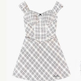 This statement plaid dress blends a bold, flirty attitude with a refined, fashion-forward aesthetic. Designed with a strapless camisole silhouette, it highlights the neckline and shoulders, while delicate lace trim adds a soft, romantic contrast. The fitted cut accentuates the waist and curves, creating a confident yet feminine look that is ideal for parties, date nights, or standout street styling.