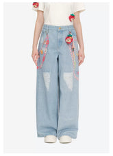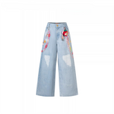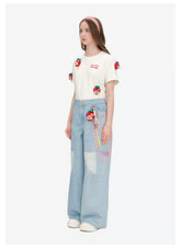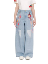 These printed wide-leg jeans from the 13DE MARZO x Chupa Chups collaboration combine playful detailing with a relaxed, fashion-forward silhouette. Designed with a loose wide-leg cut, the jeans offer effortless comfort while elongating the overall look. Featuring vibrant printed graphics and decorative charm chain elements along the sides, the design brings a bold and youthful statement. Subtle distressed accents enhance the denim texture, while signature collaborative details add a unique, collectible touch to this standout piece.