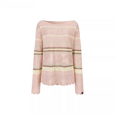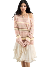 This relaxed knit top features a soft color-block stripe design paired with subtle open-knit detailing, creating a light and airy texture. The asymmetrical off-shoulder styling adds a laid-back feminine touch while enhancing the collarbone and neckline.